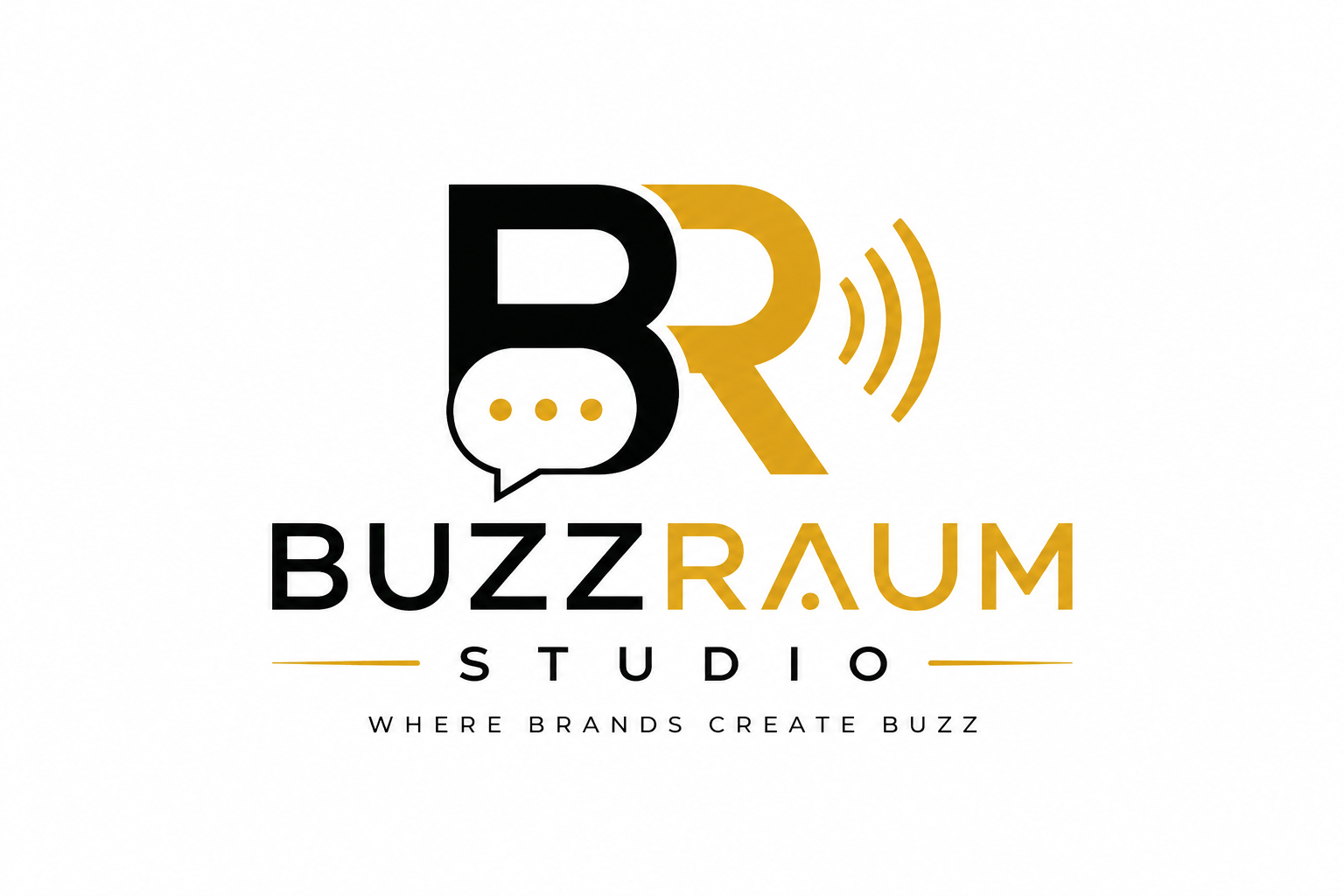 The visual identity of BuzzRaum Studio reflects its premium and contemporary positioning. The black, white, and gold logo palette symbolizes professionalism, creativity, and high-value branding.
